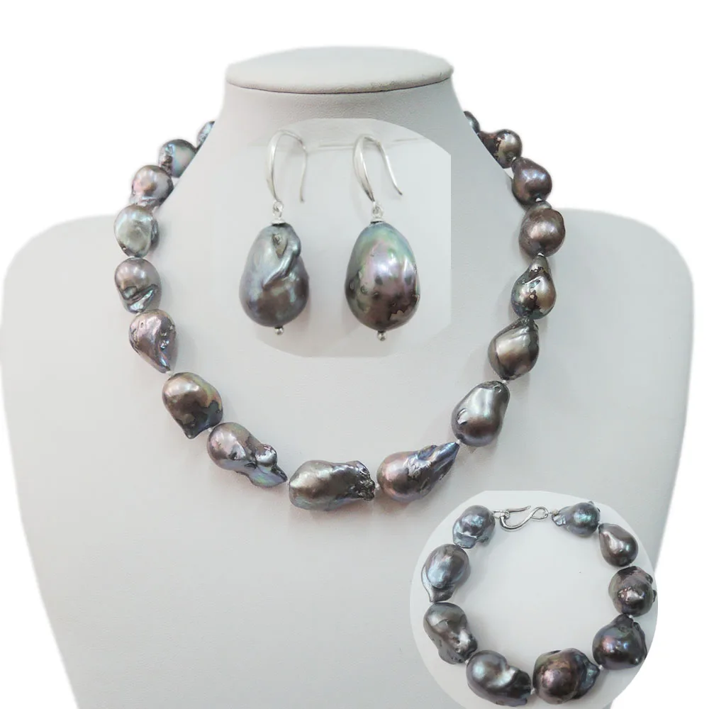 free shipping big violet baroque pearl jewelry set 100% NATURE FRESHWATER Baroque PEARL- 15-20 mm pearl necklace WITH BRACELET,Square baroque Black freshwater PEARL JEWELRY SET NECKLACE,Bracelet and EARRING-925 silver earring hook,big pearl size 17x21mm, Square baroque Black freshwater PEARL JEWELRY SET NECKLACE,Bracelet and EARRING-925 silver earring hook,big pearl size 17x21mm