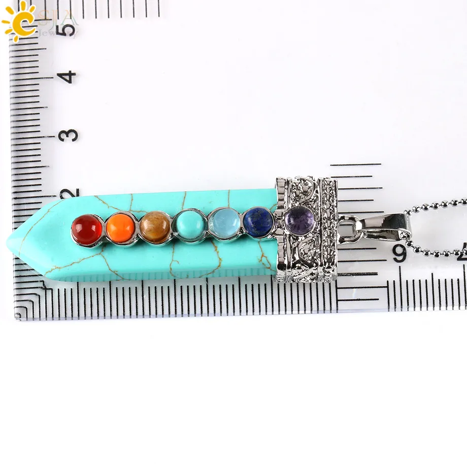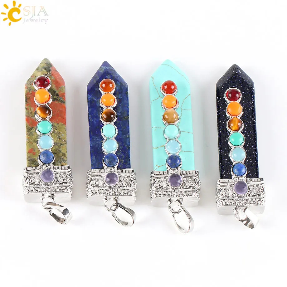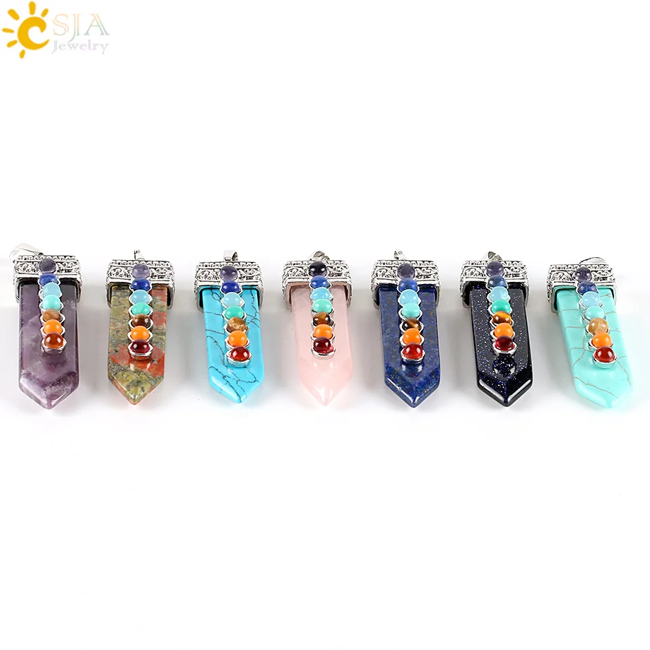 Greatest CSJA Natural Round Gem Stone Beads 7 Chakra Necklace Pendants Sword Pendulum Charms Healing Reiki W